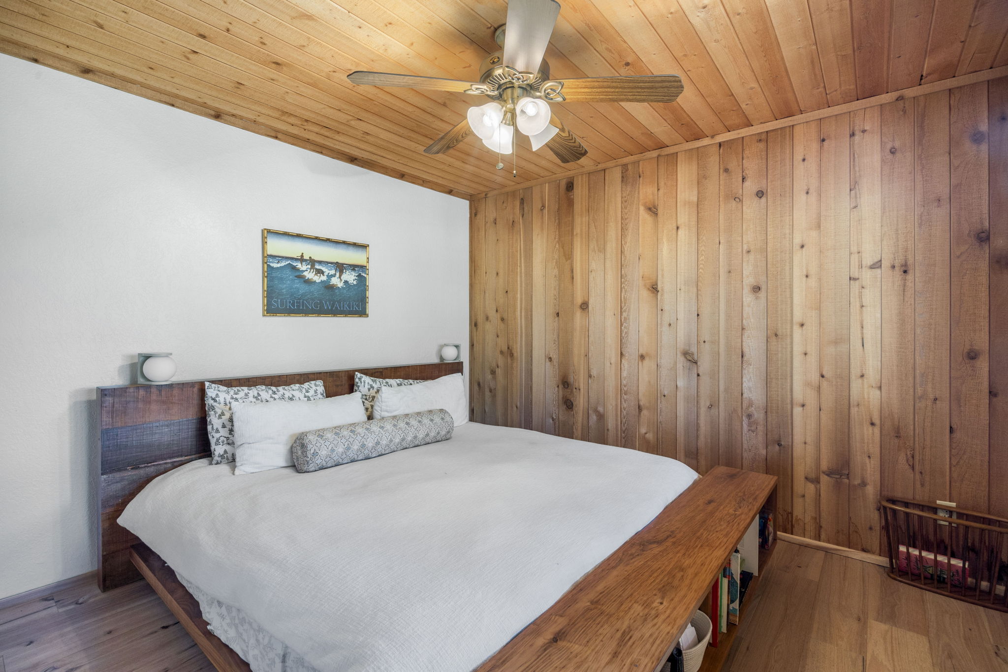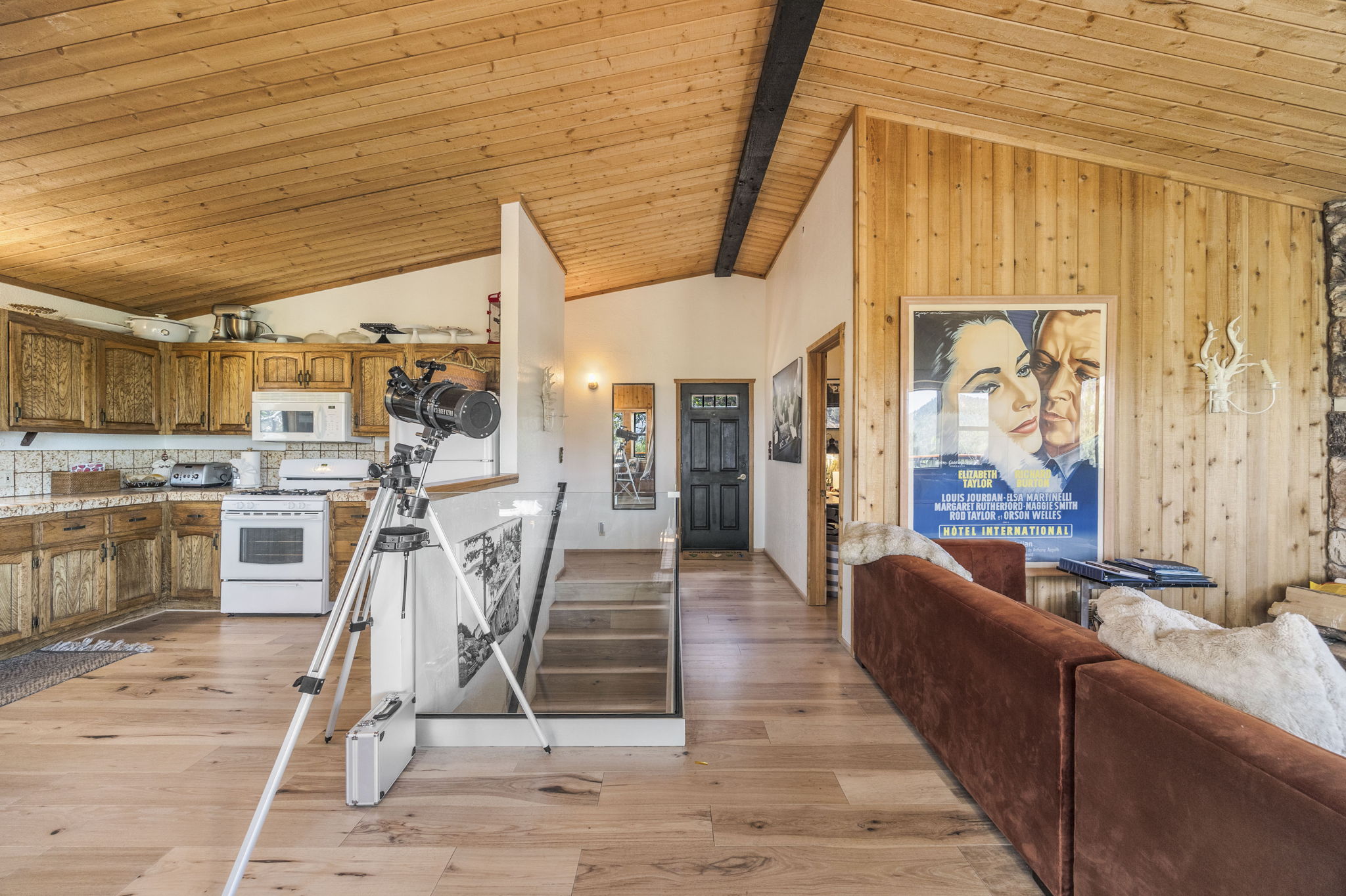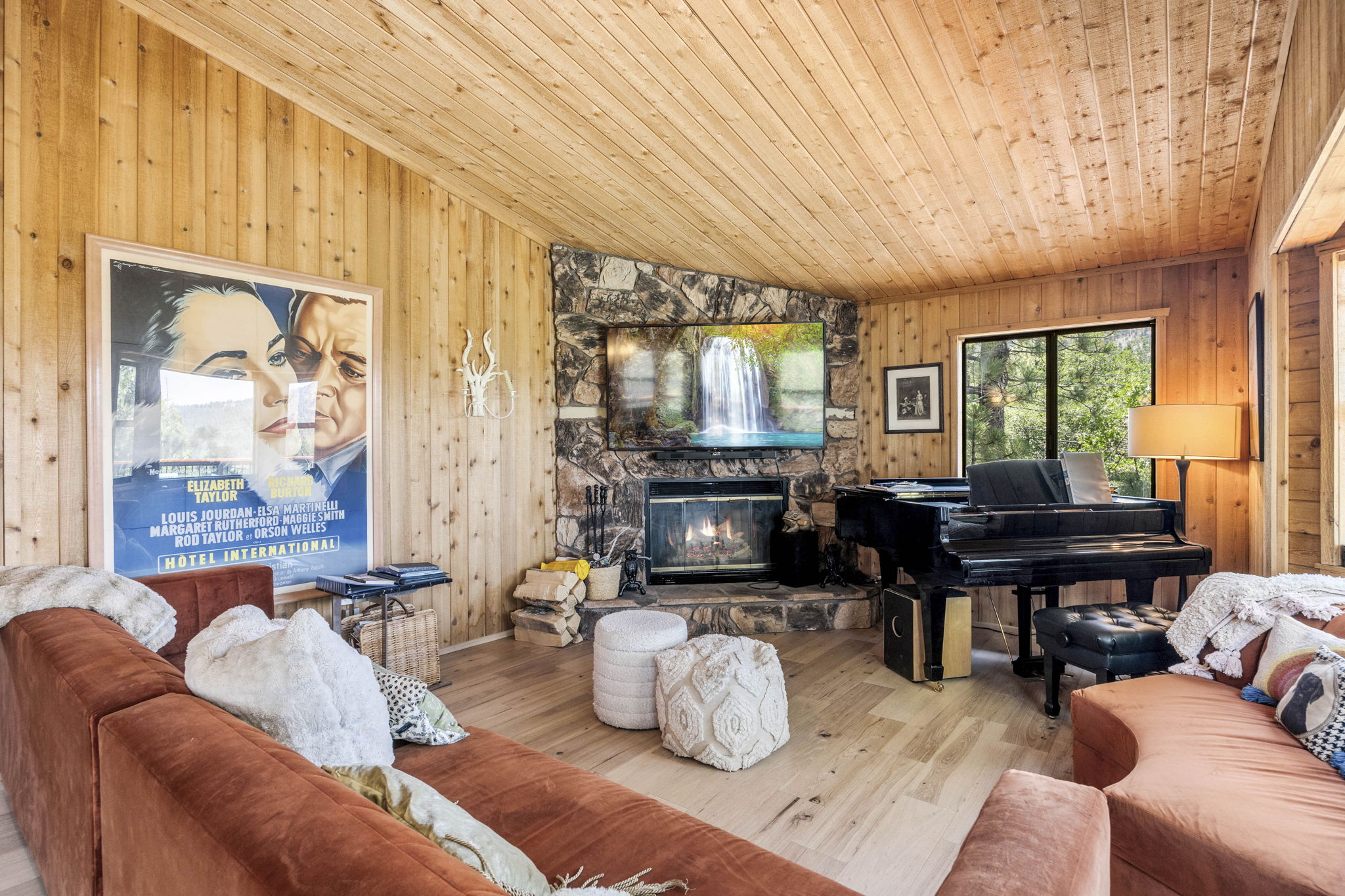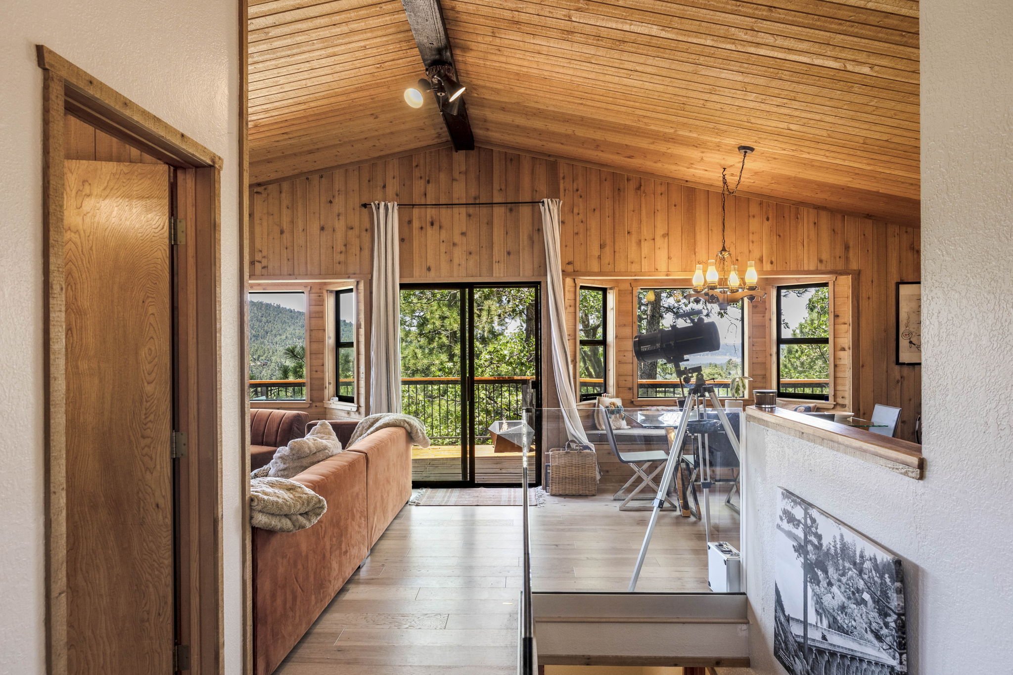 Beautiful Moonridge Cabin with awesome ski slope and Lake Views. This property offers easy access to Bear Mountain ski resort as well as the lake and many other attractions in Big Bear. Reverse floor plan with an open living area upstairs with the kitchen open to the living room and a cozy wood-burning fireplace, perfect for gathering with loved ones or curling up with a good book ~ Step outside onto the expansive deck off the living room and enjoy the fresh mountain air, where you can soak in the picturesque views while surrounded by the tranquility of oaks and pine trees ~ Warm tongue and groove accents throughout contribute to the authentic mountain cabin ambiance.